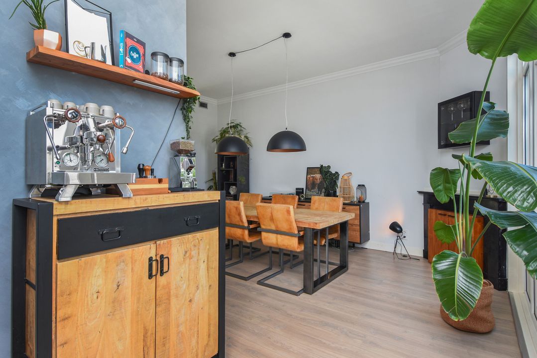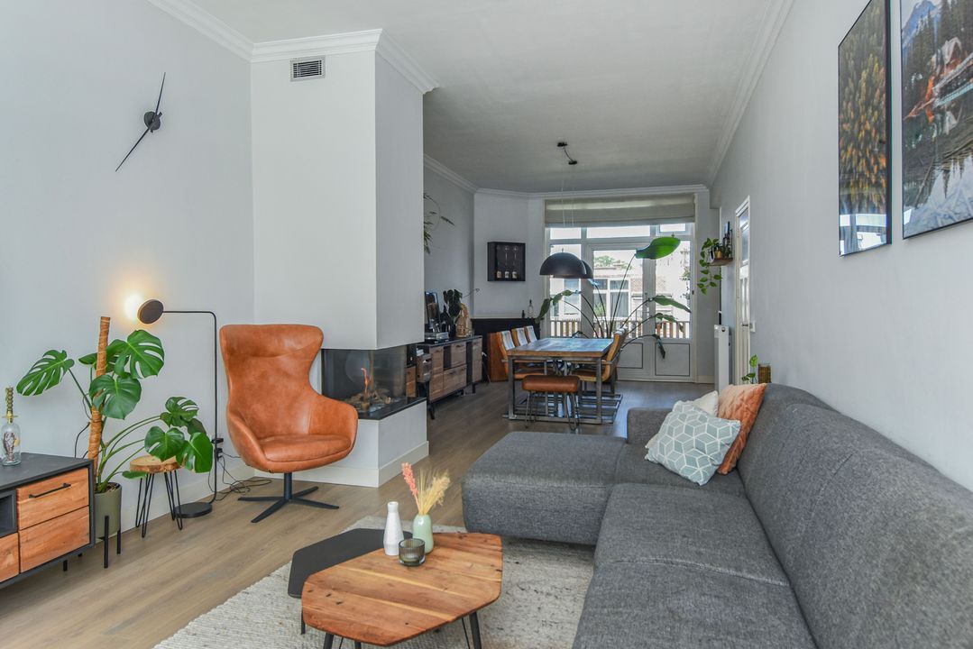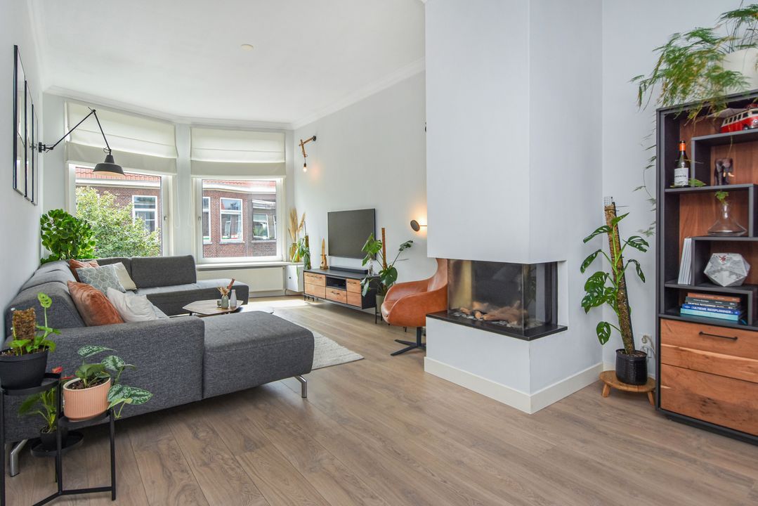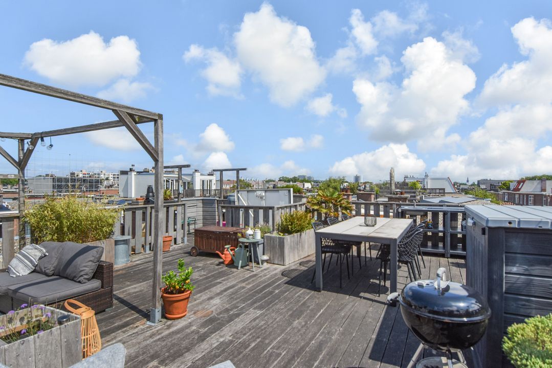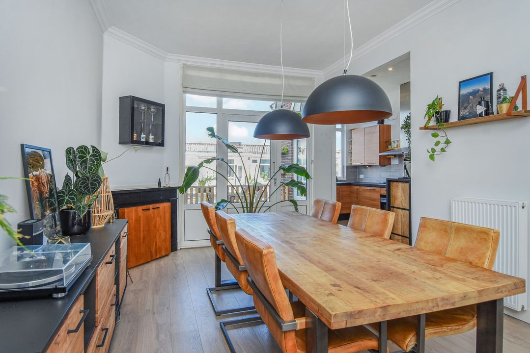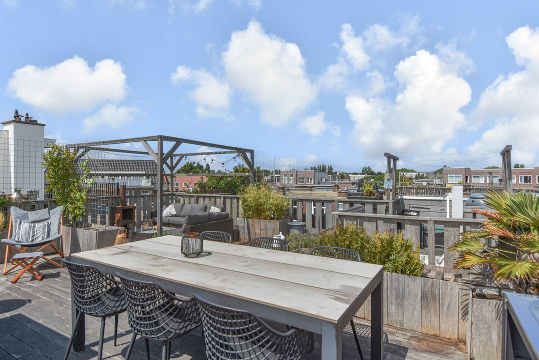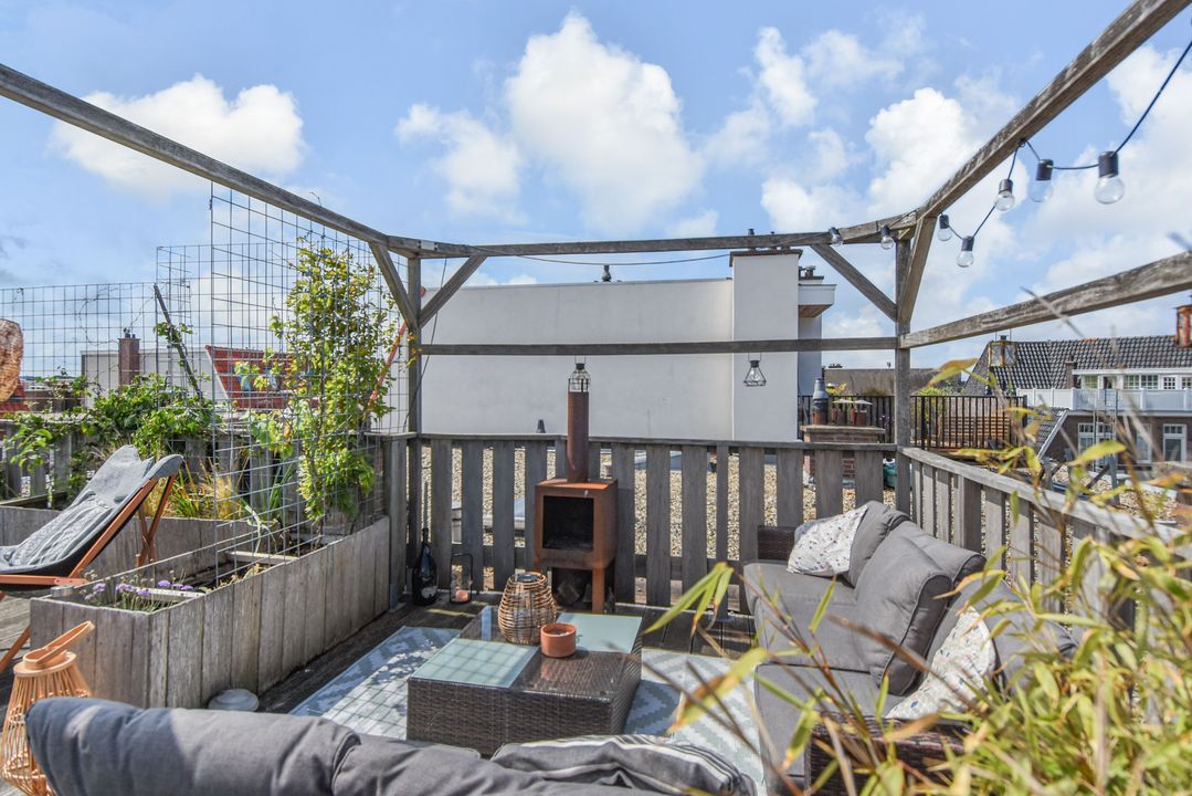 Entrance by ‘the Hague’ porch on the first floor with space for bicycles, etc.; internal staircase to the second floor; L-shaped central hall with a storage cupboard containing the washing machine, dryer, and central heating boiler; living/dining room with a bay window and gas fireplace; semi-open kitchen at the rear with a built-in 6-burner hob, Quooker, fridge/freezer; dishwasher, oven/combi microwave, and extractor hood; access to the balcony with a storage cupboard; intermediate room at the front; front side room; modern bathroom with a walk-in shower and washbasin; separate toilet; rear side room; staircase from the hall to the roof terrace of over 54m², which includes a storage room.
