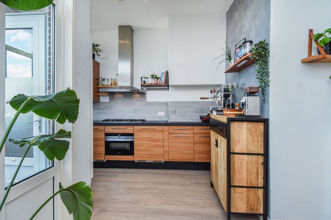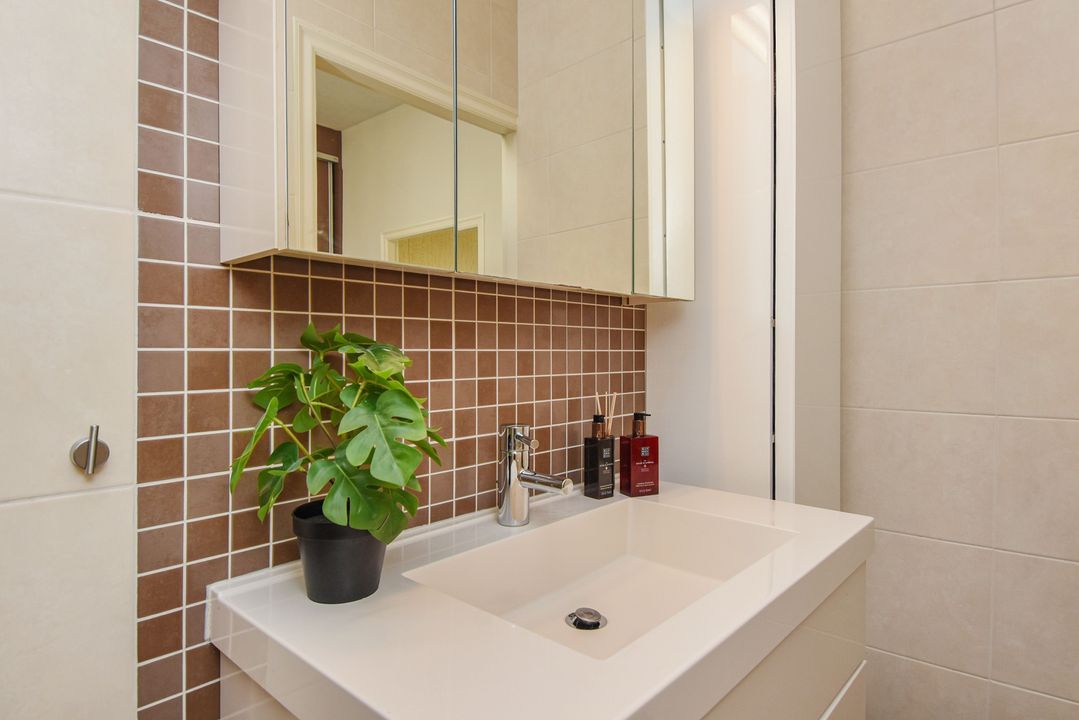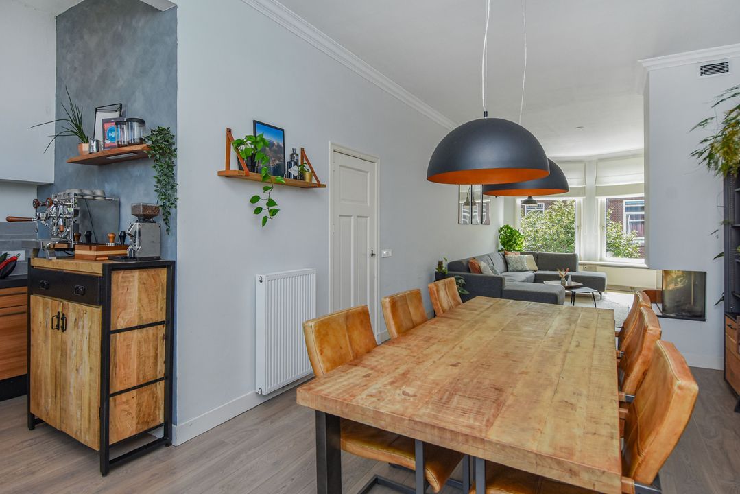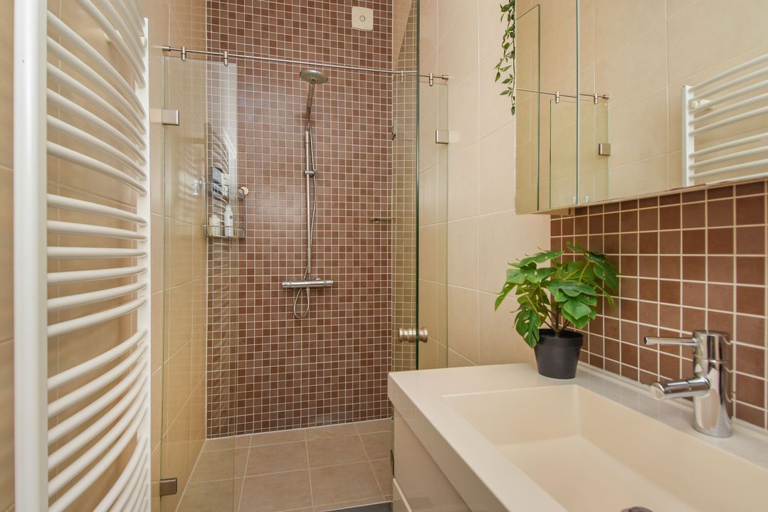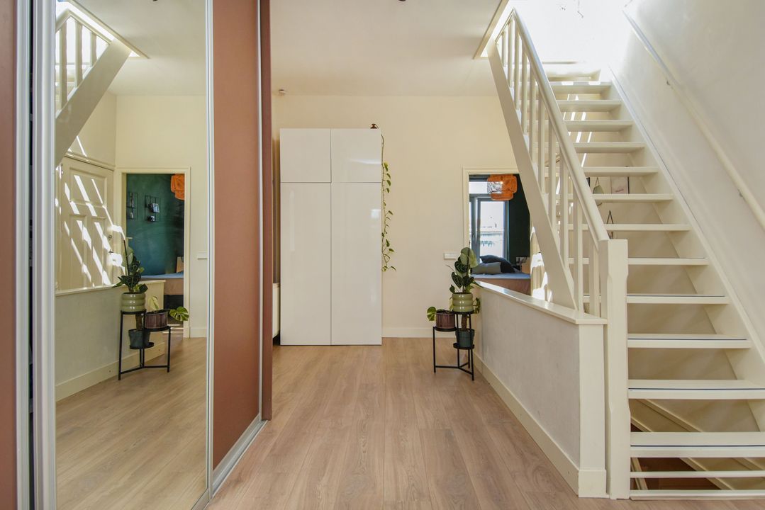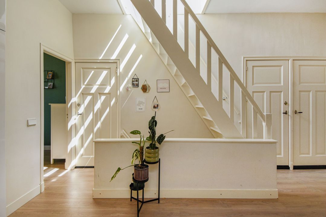 Entrance by ‘the Hague’ porch on the first floor with space for bicycles, etc.; internal staircase to the second floor; L-shaped central hall with a storage cupboard containing the washing machine, dryer, and central heating boiler; living/dining room with a bay window and gas fireplace; semi-open kitchen at the rear with a built-in 6-burner hob, Quooker, fridge/freezer; dishwasher, oven/combi microwave, and extractor hood; access to the balcony with a storage cupboard; intermediate room at the front; front side room; modern bathroom with a walk-in shower and washbasin; separate toilet; rear side room; staircase from the hall to the roof terrace of over 54m², which includes a storage room.