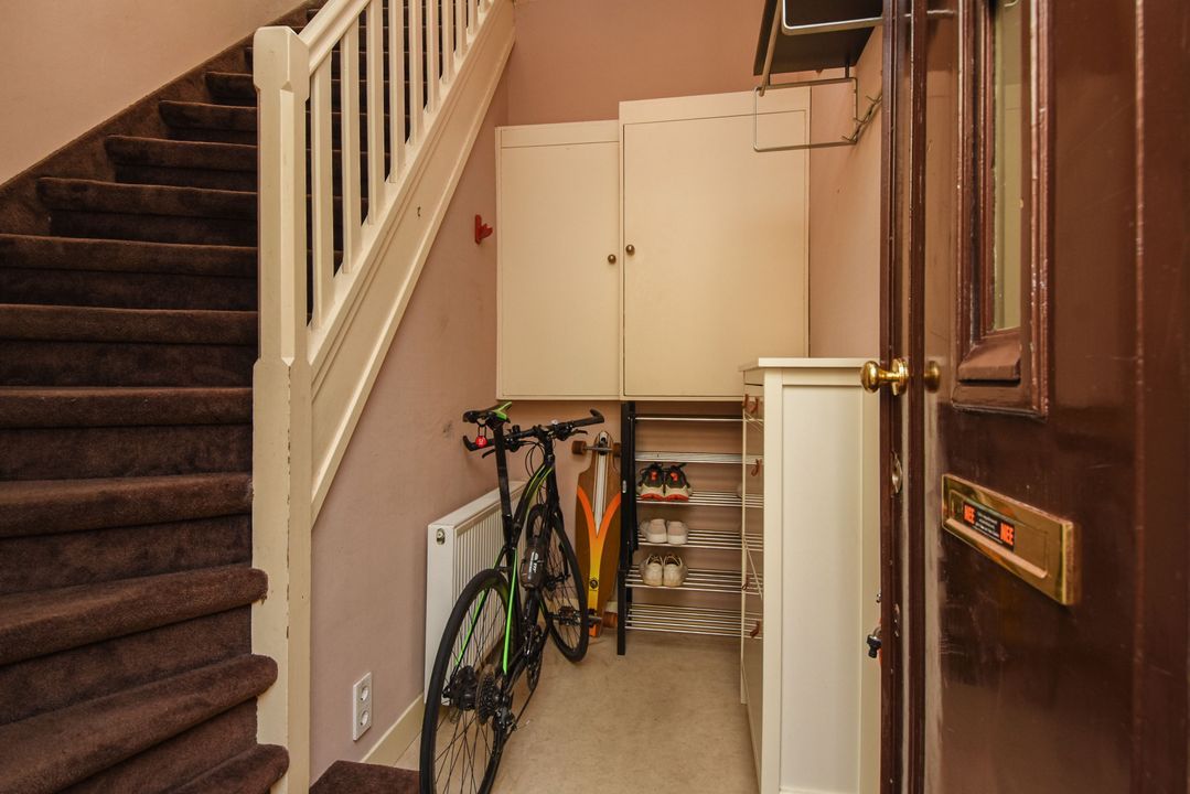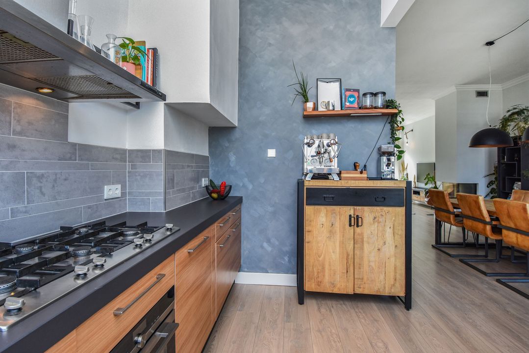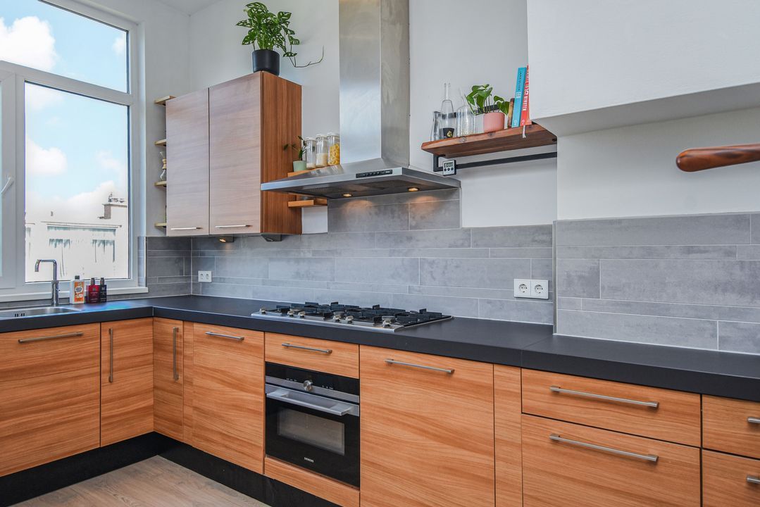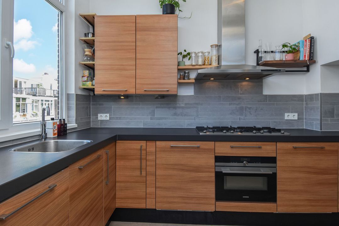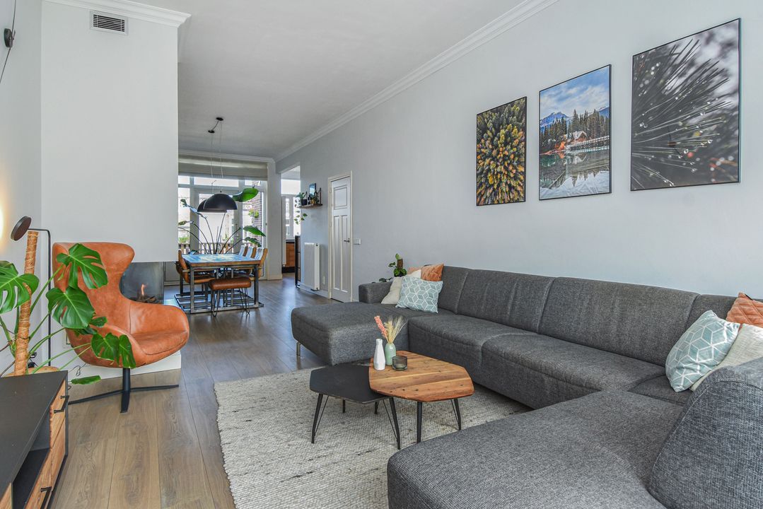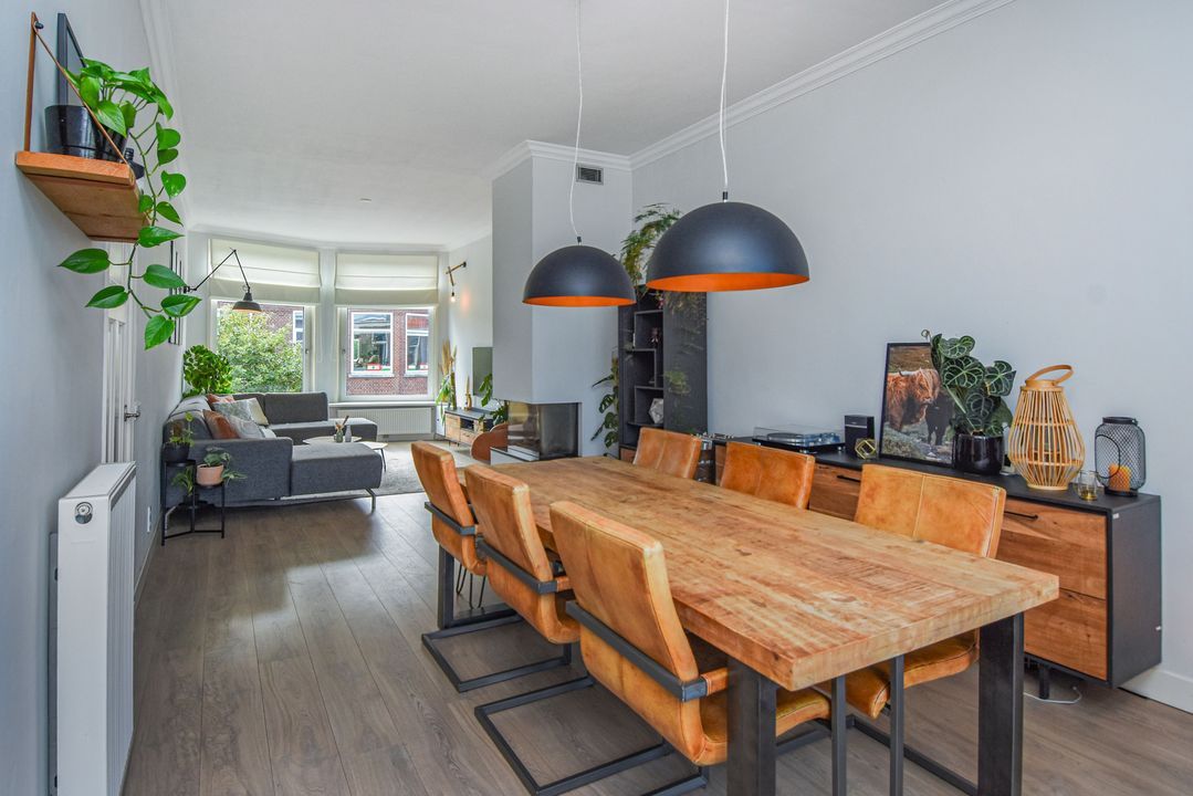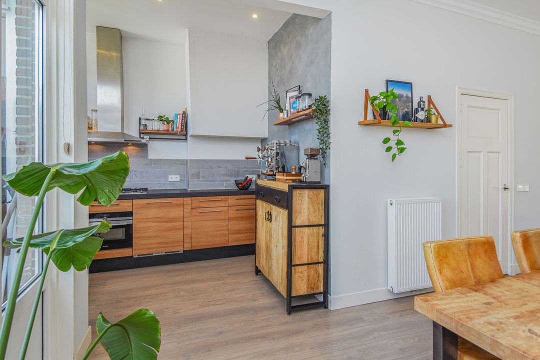 Entrance by ‘the Hague’ porch on the first floor with space for bicycles, etc.; internal staircase to the second floor; L-shaped central hall with a storage cupboard containing the washing machine, dryer, and central heating boiler; living/dining room with a bay window and gas fireplace; semi-open kitchen at the rear with a built-in 6-burner hob, Quooker, fridge/freezer; dishwasher, oven/combi microwave, and extractor hood; access to the balcony with a storage cupboard; intermediate room at the front; front side room; modern bathroom with a walk-in shower and washbasin; separate toilet; rear side room; staircase from the hall to the roof terrace of over 54m², which includes a storage room.