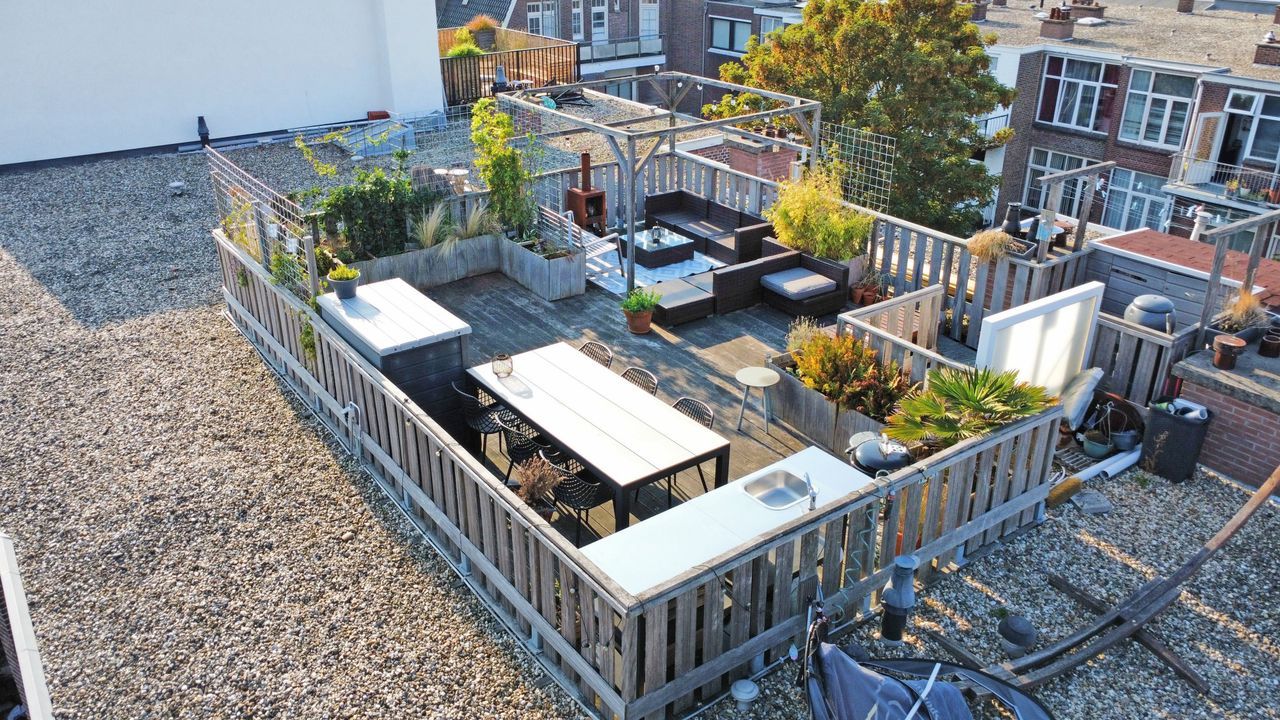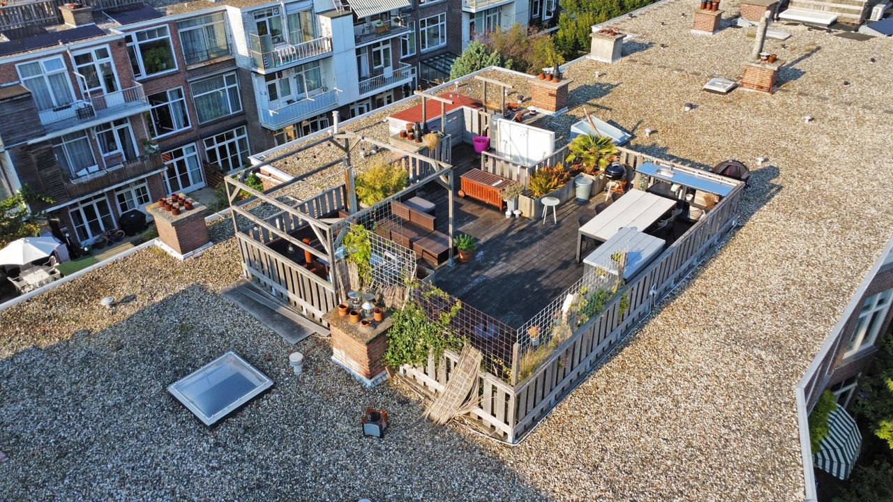 Entree via Haags portiek op 1e verdieping met ruimte voor fietsen ed.; inpandige trap naar 2e verdieping alwaar L-vormige centrale hal 490x340 met bergkast met opstelplaats voor de wasmachine, droger en cv-gasketel; woon-/eetkamer 1100x363 met erker en gashaard; achtergelegen half open keuken 405x211 met inbouw 6 pits kookplaat, Quooker, koel-/vrieskast; vaatwasser, oven/combimagnetron en afzuigkap; toegang naar balkon 263x110 met bergkast; tussenkamer voorzijde 362x235; voorzijkamer 362x235; moderne badkamer 313x127 met inloopdouche en wastafelmeubel; separaat toilet; achterzijkamer 405x256; vanuit de hal vaste trap naar het dakterras van ruim 54m², welke o.a. is voorzien van een berging.