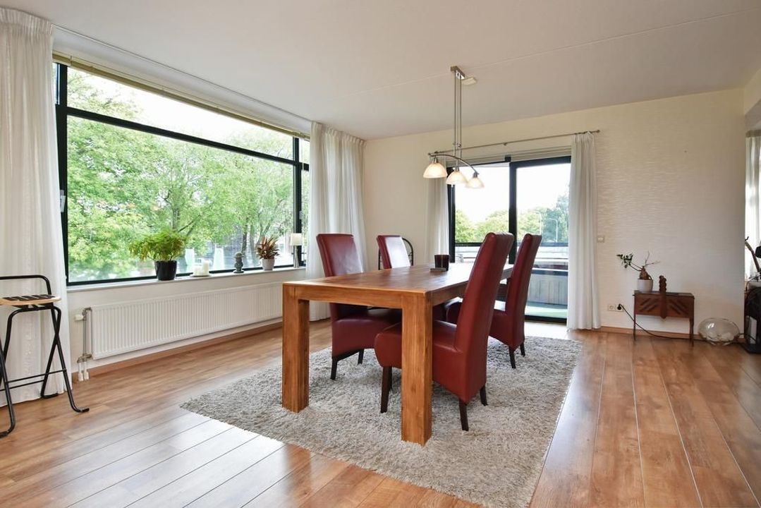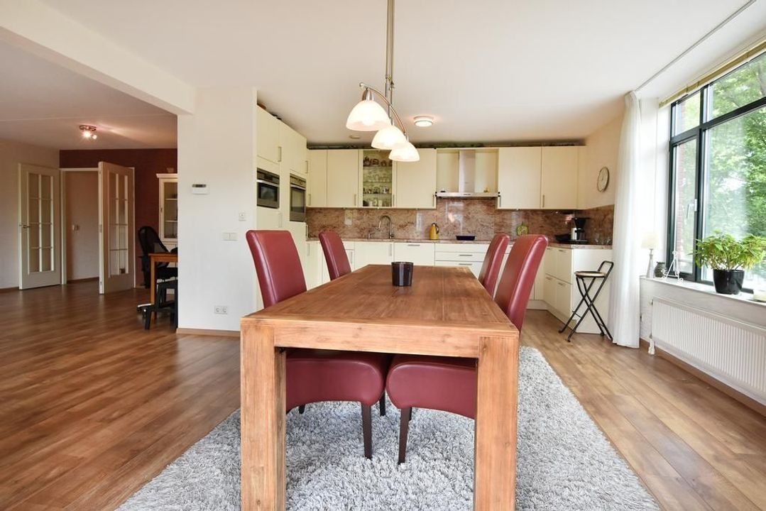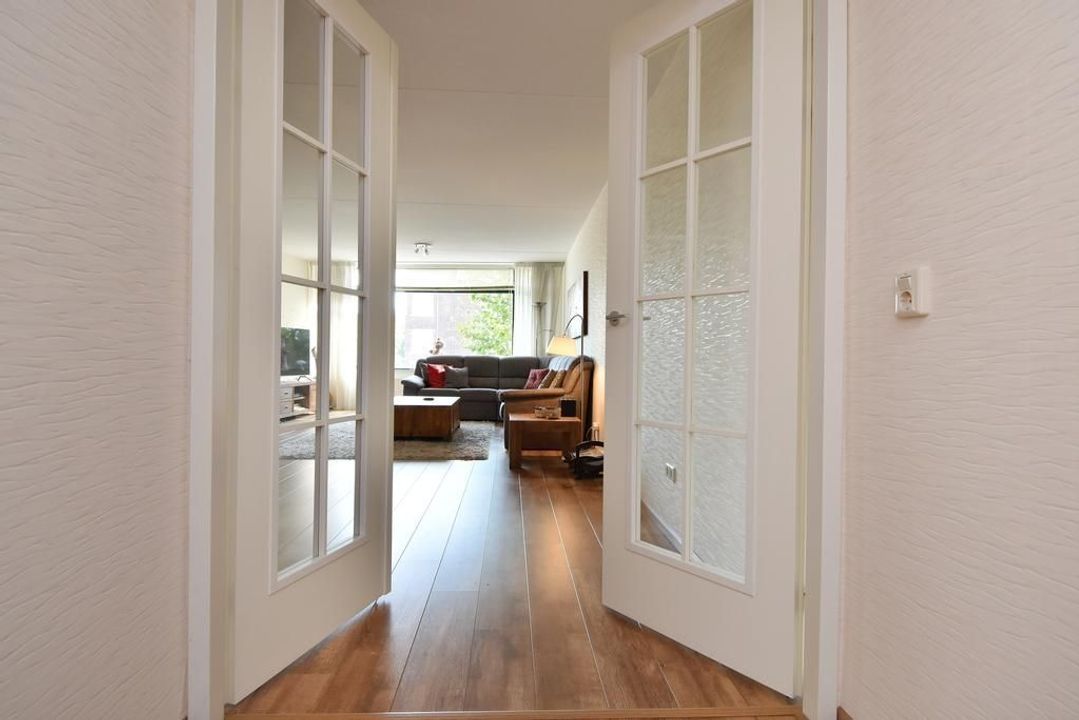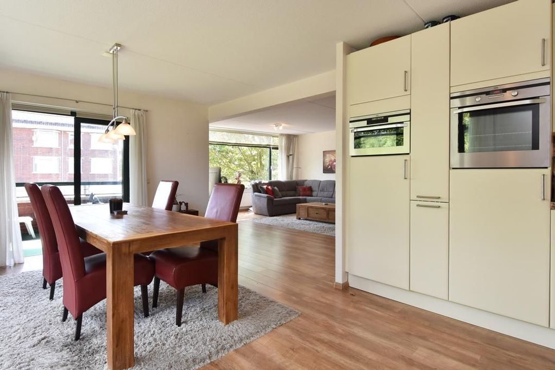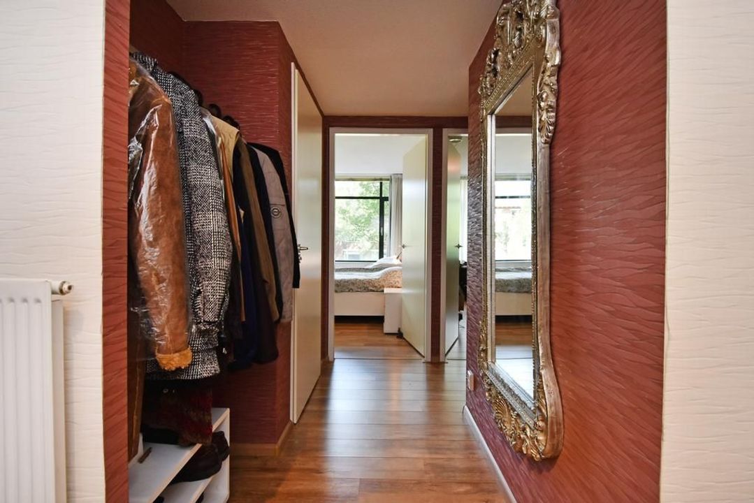 Enclosed porch with staircase and elevator to the second floor. Apartment entrance, with the meter cupboard next to the entrance (outside the apartment). A separate toilet with a hand basin is located in the T-shaped hall. The hall leads into the dining room with an open, modern corner kitchen equipped with built-in appliances. From the dining room, two French doors open onto the terrace. The living room is located at the front of the apartment with unobstructed views over Thorbeckelaan. The entire apartment features beautiful laminate flooring, two spacious bedrooms, a modern bathroom (2022) with a corner bathtub, shower with shower enclosure, double vanity with vanity, and a toilet. The large utility room is practical, housing the central heating system and washing machine.