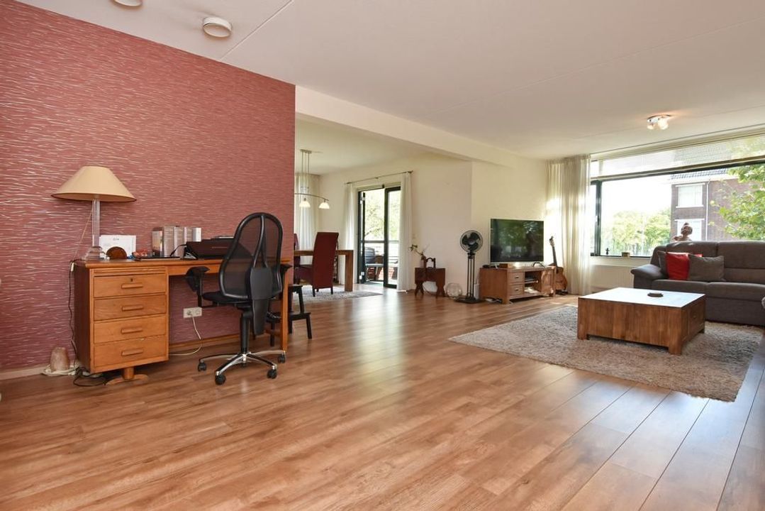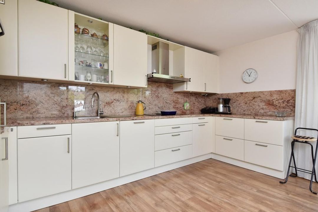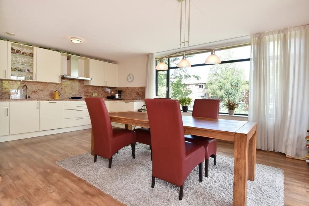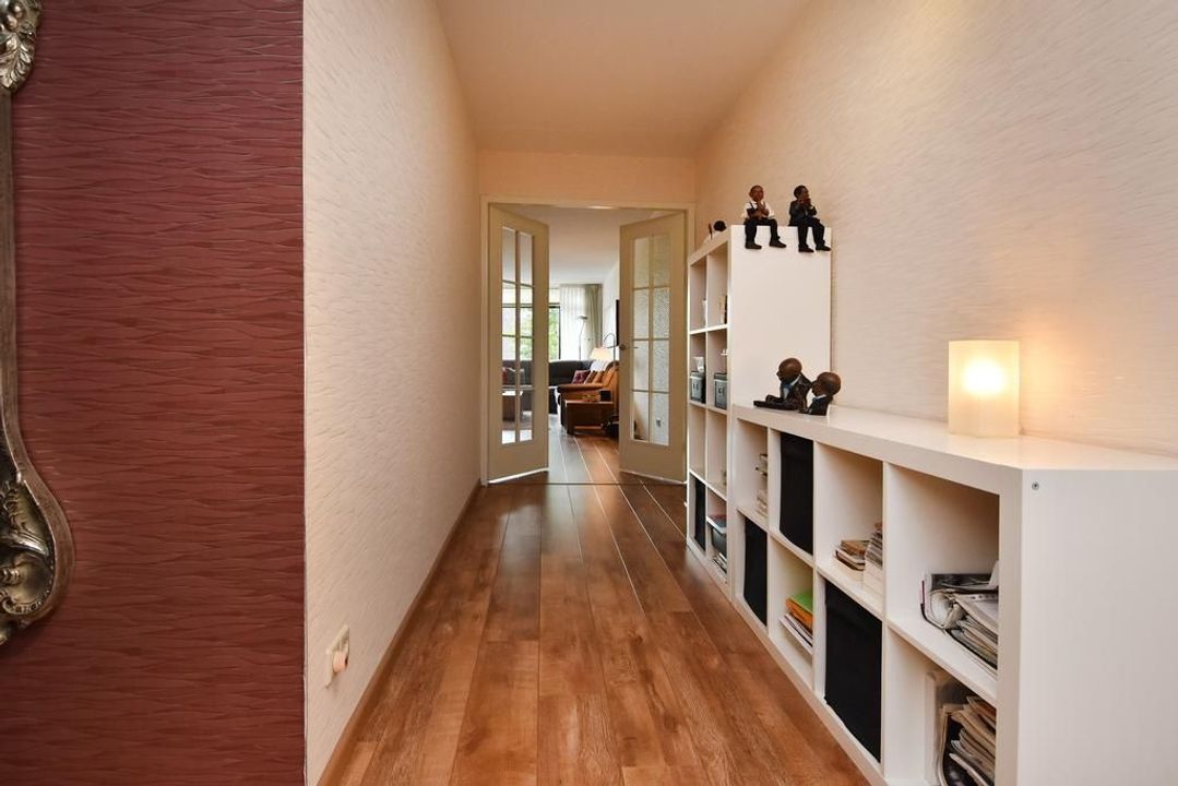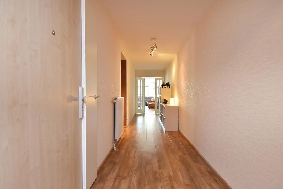 Enclosed porch with staircase and elevator to the second floor. Apartment entrance, with the meter cupboard next to the entrance (outside the apartment). A separate toilet with a hand basin is located in the T-shaped hall. The hall leads into the dining room with an open, modern corner kitchen equipped with built-in appliances. From the dining room, two French doors open onto the terrace. The living room is located at the front of the apartment with unobstructed views over Thorbeckelaan. The entire apartment features beautiful laminate flooring, two spacious bedrooms, a modern bathroom (2022) with a corner bathtub, shower with shower enclosure, double vanity with vanity, and a toilet. The large utility room is practical, housing the central heating system and washing machine.