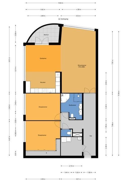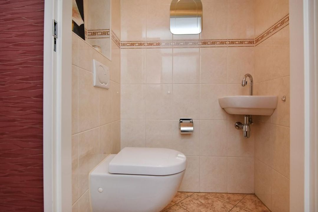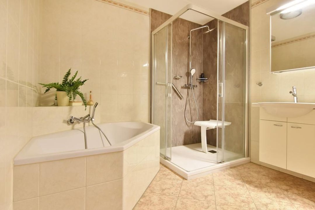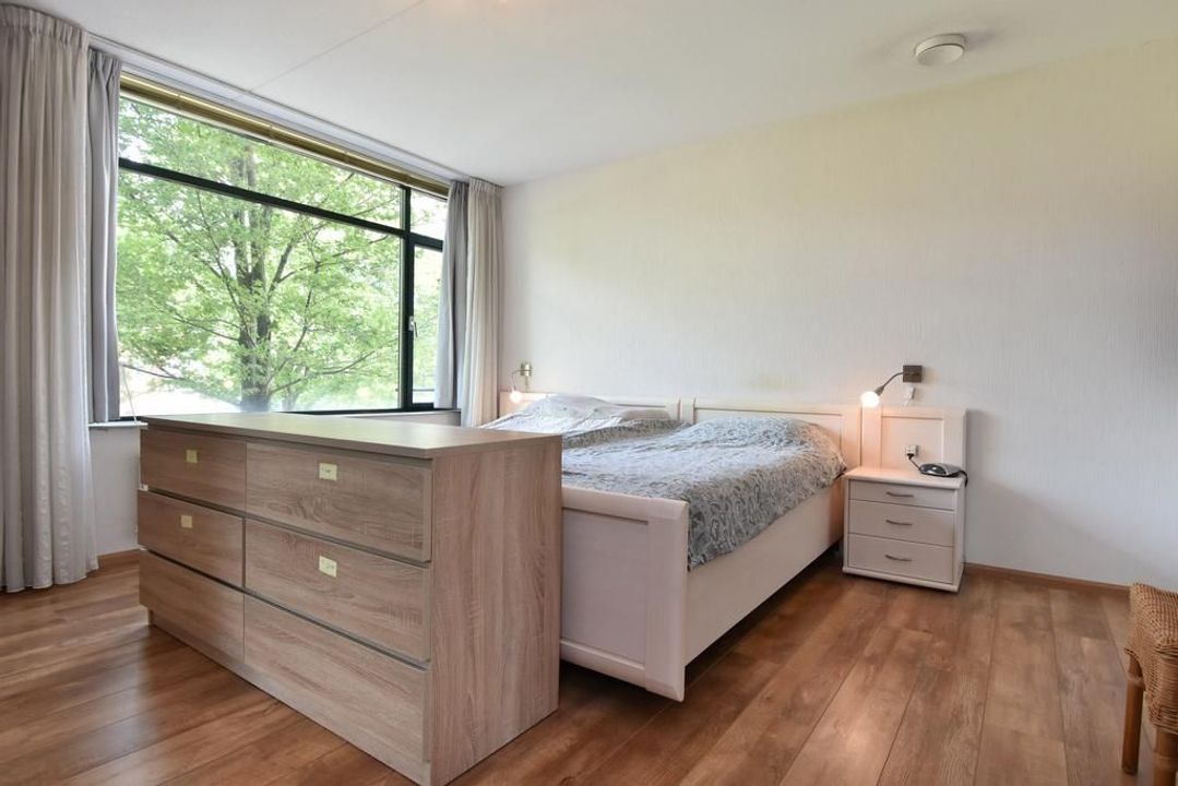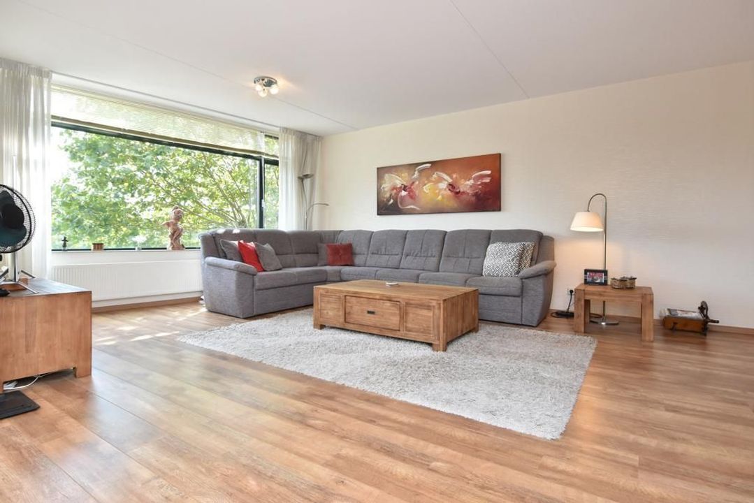 Enclosed porch with staircase and elevator to the second floor. Apartment entrance, with the meter cupboard next to the entrance (outside the apartment). A separate toilet with a hand basin is located in the T-shaped hall. The hall leads into the dining room with an open, modern corner kitchen equipped with built-in appliances. From the dining room, two French doors open onto the terrace. The living room is located at the front of the apartment with unobstructed views over Thorbeckelaan. The entire apartment features beautiful laminate flooring, two spacious bedrooms, a modern bathroom (2022) with a corner bathtub, shower with shower enclosure, double vanity with vanity, and a toilet. The large utility room is practical, housing the central heating system and washing machine.