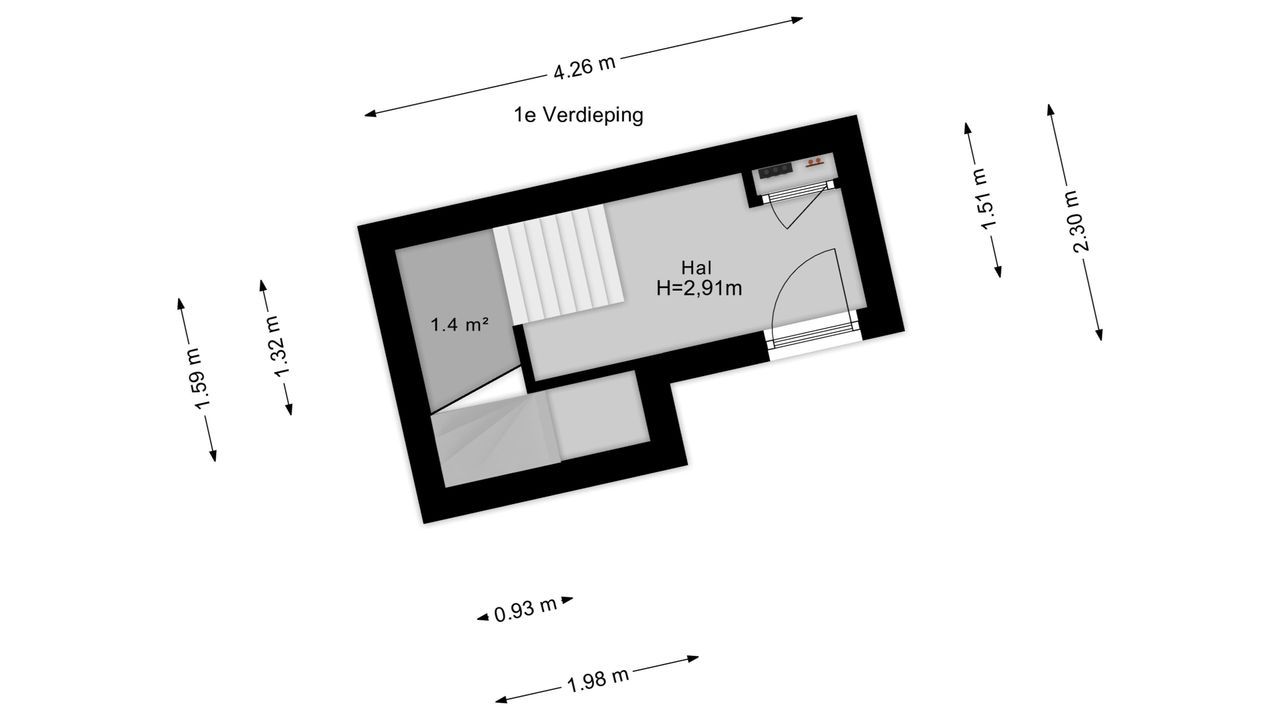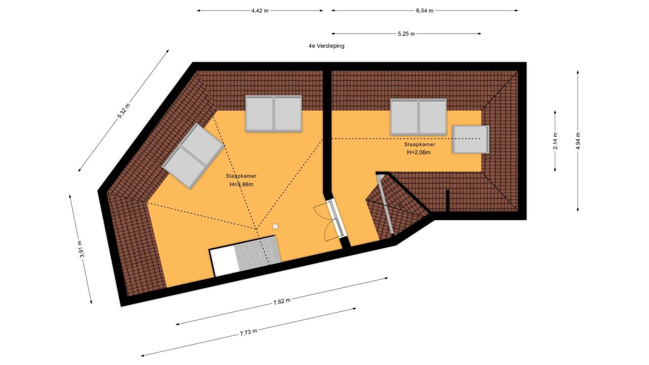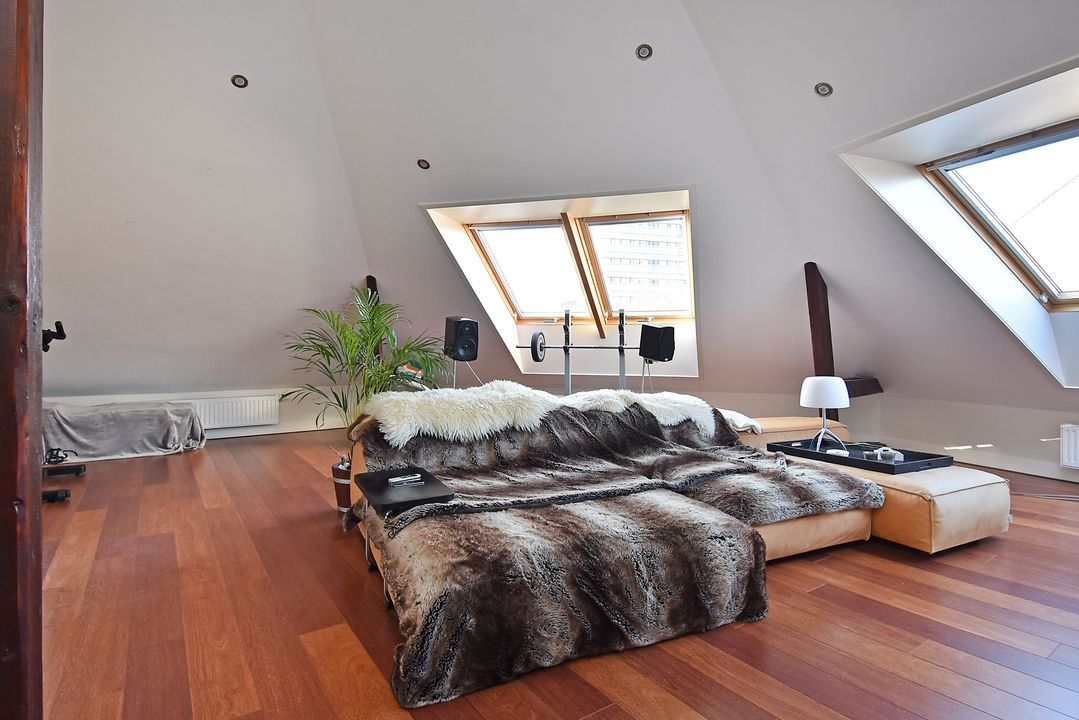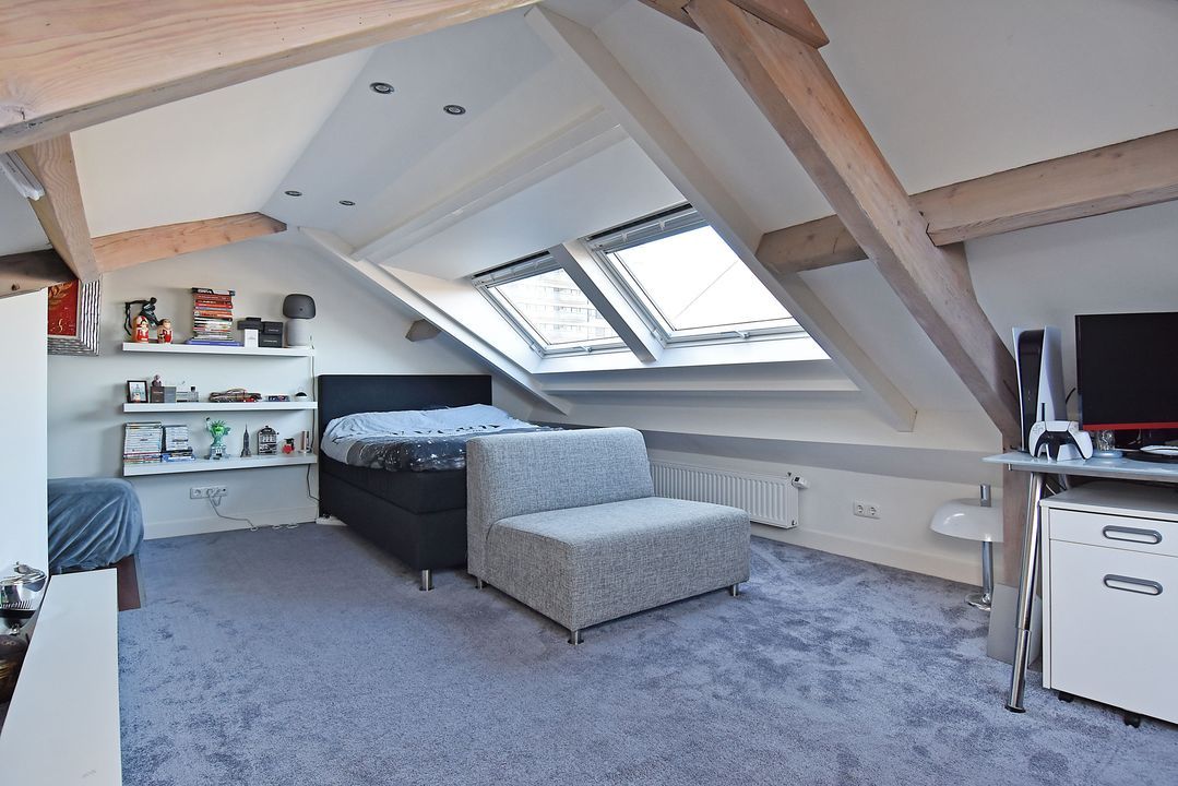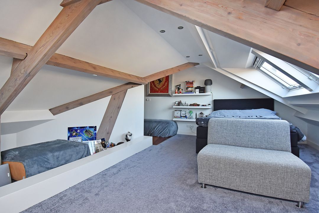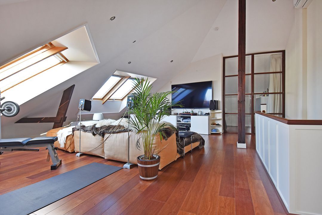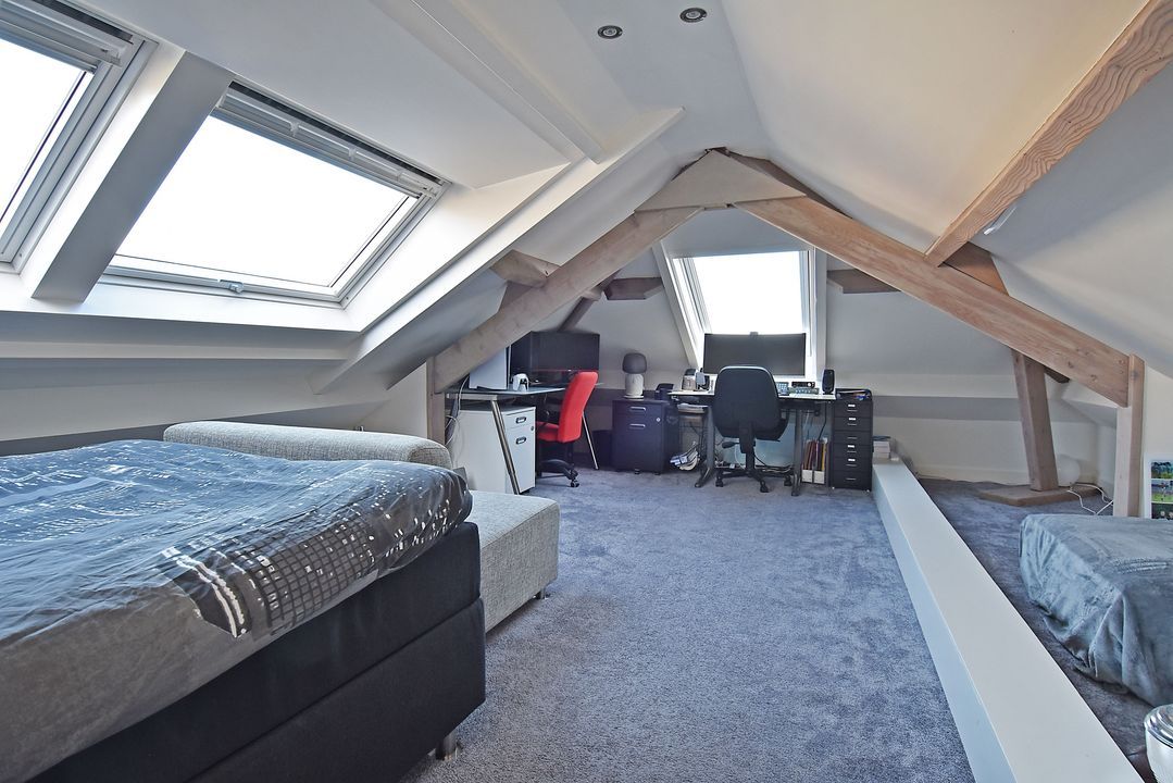 4e verdieping: multifunctionele kap-etage ca. 46m² met diverse dakramen met unieke indeling bestaande uit een grotendeels open ruimte thans o.a. in gebruik als sport/gymruimte en een extra slaapkamer; op deze verdieping is het vrij eenvoudig om een 2e badkamer/doucheruimte/toilet te realiseren.